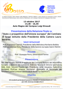 La Sezione europea Gianni Merlini della Biblioteca Norberto Bobbio dell’Università di Torino è lieta di organizzare la presentazione della Relazione finale su “Stato e prospettive dell’Unione europea” del Comitato di Saggi istituito dalla Presidente della Camera Laura Boldrini.